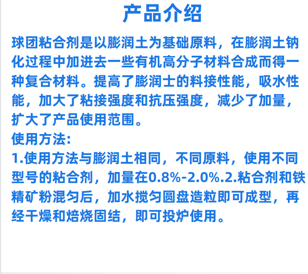 產(chǎn)品介紹:球團粘合劑是以膨潤土為基礎(chǔ)原料,在膨潤土鈉化過程中加進去一些有機高分子材料合成而得一種復合材料。提高了膨潤土的粘接性能、吸水性能,加大了粘接強度和抗壓強度,減少了加量,擴大了產(chǎn)品使用范圍。應用范圍:應用于各種鐵精粉球團礦造球。包裝及貯存:25k……