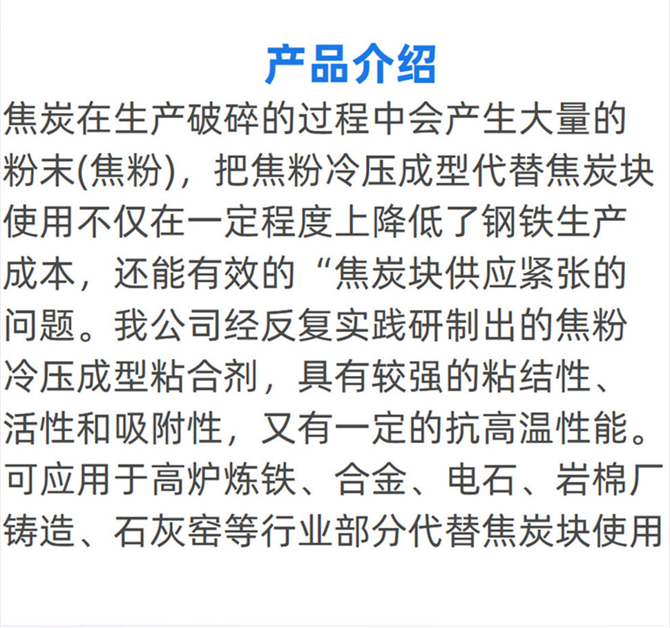 產(chǎn)品介紹:焦炭在生產(chǎn)破碎的過程中會產(chǎn)生大量的粉末(焦粉),把焦粉冷壓成型代替焦炭塊使用不僅在一定程度上降低了鋼鐵生產(chǎn)成本,還能有效的*焦炭塊供應(yīng)緊張的問題。我公司經(jīng)反復(fù)實踐研制出的焦粉冷壓成型粘合劑,具有較強(qiáng)的粘結(jié)性、活性和吸附性,又有一定的抗高溫性能……