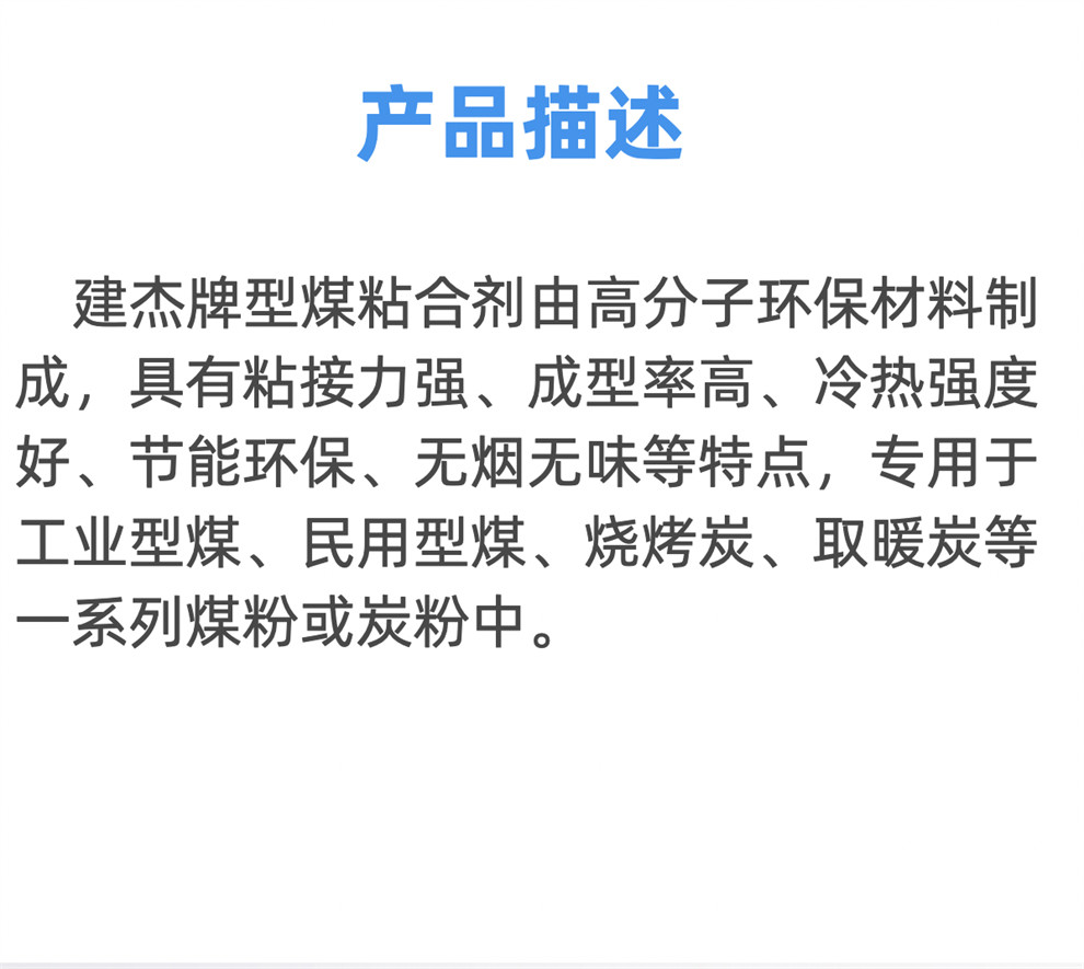 產(chǎn)品介紹:建杰牌型煤粘合劑由高分子環(huán)保材料制成,具有粘接力強、成型率高、冷熱強度好、節(jié)能環(huán)保、無煙無味等特點,專用于工業(yè)型煤、民用型煤、燒烤炭、取暖炭等一系列煤粉或炭粉中。應(yīng)用范圍:專用于工業(yè)型煤、民用型煤、燒烤炭、取暖炭等一系列煤粉或炭粉中。產(chǎn)品特點……